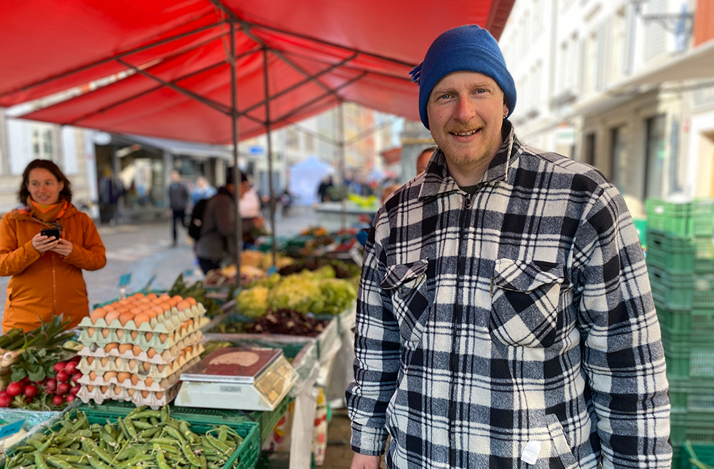Auf Ralf Stuckis Hof in Oberwil werden Gemüse, Früchte und Beeren frei von Pestiziden produziert. An seinem Stand am Samschtigmärt im Obertor verkauft er Frisch- und Hofprodukte, Fleisch und Käse – alles in BIO-Qualität.